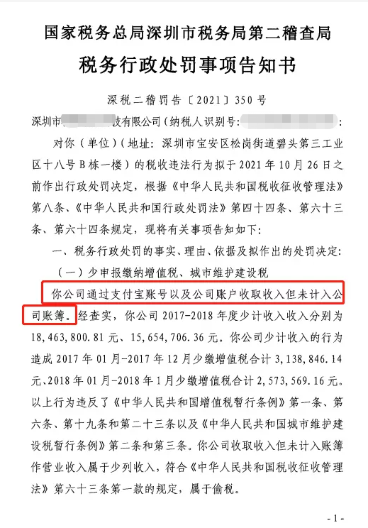 深圳某科技公司,通過支付寶賬號(hào)以及公司賬號(hào)收取收入,導(dǎo)致少計(jì)收入3411.85萬元,造成少繳增值稅571.24萬元以及城市維護(hù)建設(shè)稅。此外,稅務(wù)局通過核定征收的方式,查明該公司少繳企業(yè)所得稅37.43萬元。最終,上述公司被處百分之五十的罰款,共計(jì)3243277.46元。